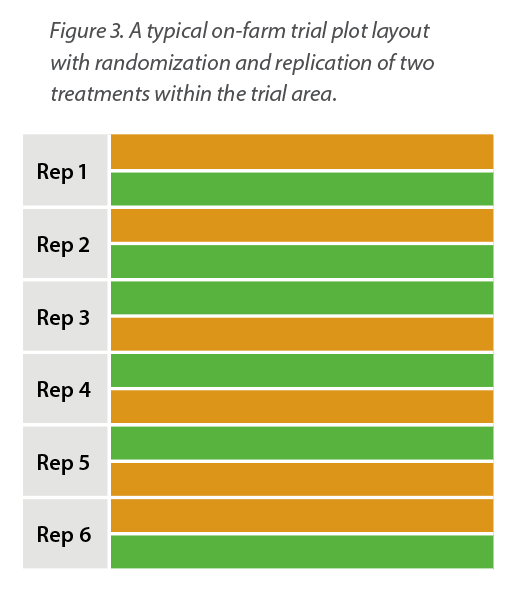 There are a couple of key considerations to make an on-farm trial useful. A specific question will help guide treatment selection, trial location and design. Because on-farm trials are testing treatments to see if they should be adopted on the farm, the treatments selected should be realistic to normal farm operations. Physical layout of the trial is also important. Although an on-farm trial can encompass variability across a field, the variability within the trial area should not unnecessarily introduce bias to the trial results. For example, locating a trial where a field drain runs the length of an entire strip could skew the trial results. Replication of treatments across the field is important to determine whether yield differences are actually a result of the treatment, rather than simply a result of field variability within the trial area. Randomizing the order of treatments within the replicates helps reduce any bias the natural field variability could introduce into the data. Figure 3 shows an example of a randomized and replicated trial layout. Collecting midseason data, whether it be plant counts, nodulation ratings, disease ratings or otherwise, depending on trial type, can help validate yield results at harvest.