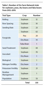 Since its beginning, the OFN has facilitated approximately 335 trials (Figure 1, Table 1). In the 2019 growing season alone, the OFN conducted 51 soybean trials, six dry bean trials and eight pea trials, covering a range of agronomic questions from the efficacy of fungicide applications in soybeans, peas and dry beans to soybean seeding rate, and several in between.