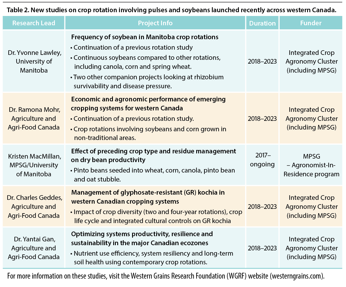 Several new studies on crop rotation involving pulses and soybeans have been launched recently across western Canada (Table 2).