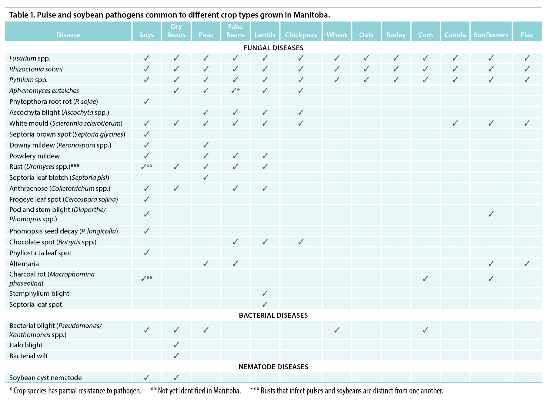 Except for a few common pathogens, pulse and soybean crops are hosts to a different range of diseases than other crops grown in Manitoba (Table 1). This means their presence in a rotation can reduce the impact of certain diseases. This is indicated by the missing checkmarks in Table 1.
