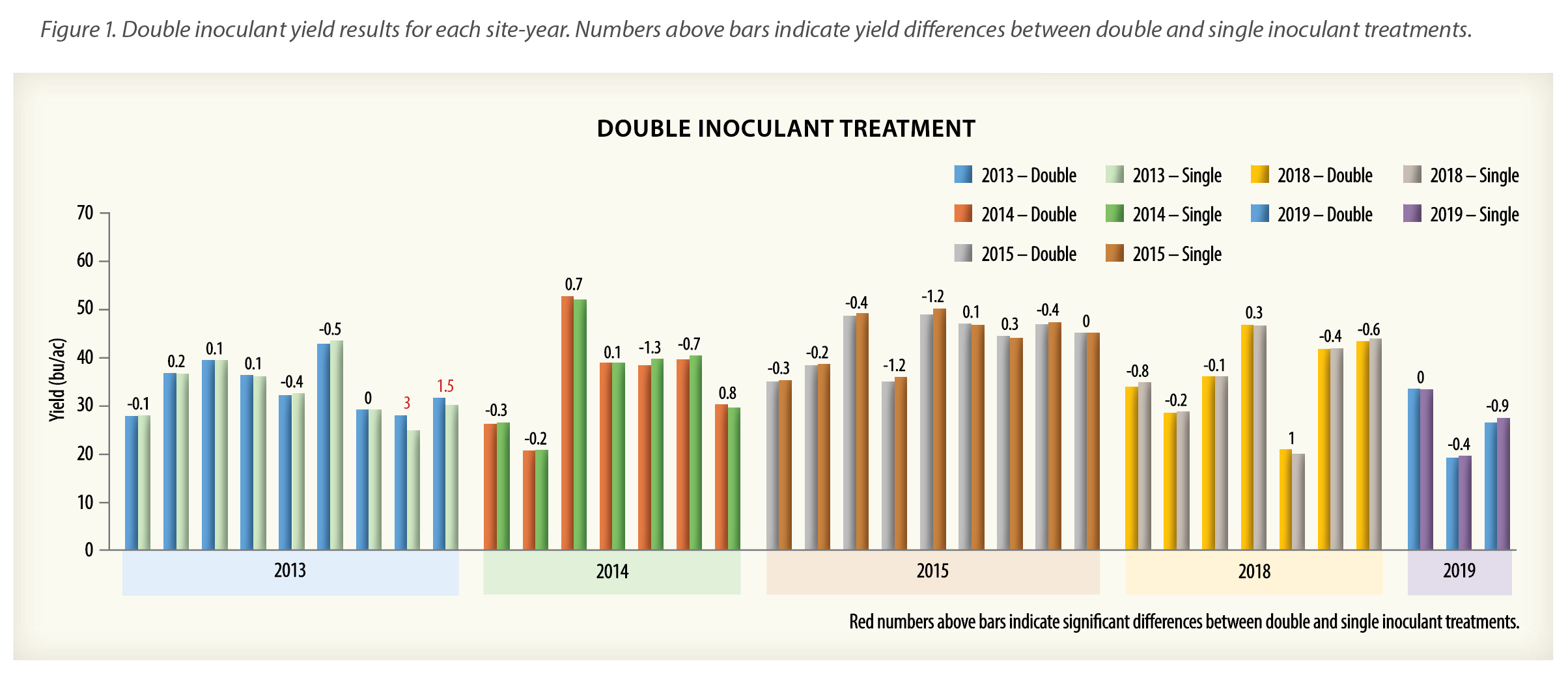 In 2013, questions started to surface about the benefits of doubling up on inoculant after soybeans had been grown on the same piece of land for a couple of years. That is when the OFN began investigating soybean inoculant practices. Double vs. single inoculant trials were set up in fields where there were at least two years of soybean history in the last ten years. There have been a total of 36 double vs. single inoculant trials since. Only two trials had a significant yield increase with double inoculant compared to single inoculant. For the other 34 trials, there was no significant yield difference between double and single inoculant strategies.