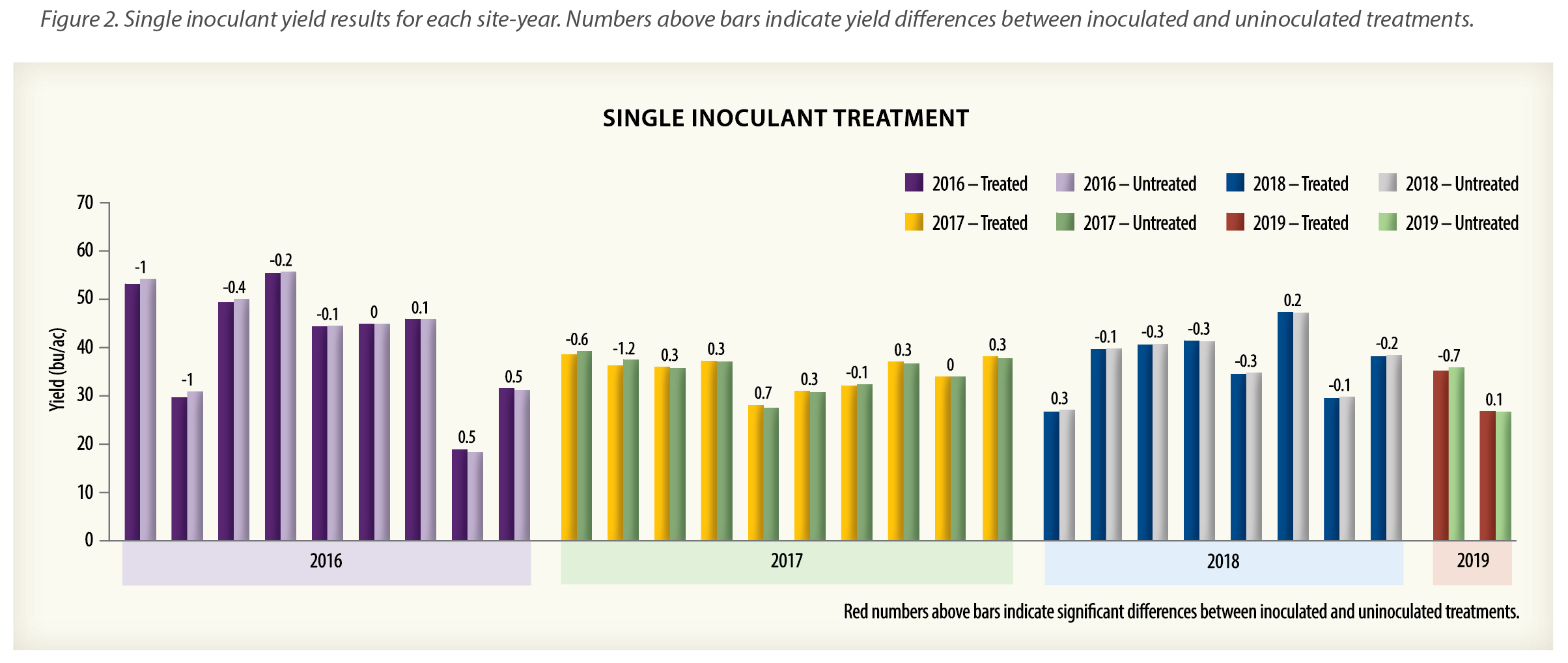 As soybean production history in the province continued to expand, the OFN began investigating a second inoculant question — comparing single vs. no inoculant in soybean fields where there were at least three years of soybean history in the last 10 years. Since starting these trials in 2016, there have been a total of 29 single inoculant trials through the OFN. To date, there has been no significant yield response to single inoculant compared to no inoculant in these trials.