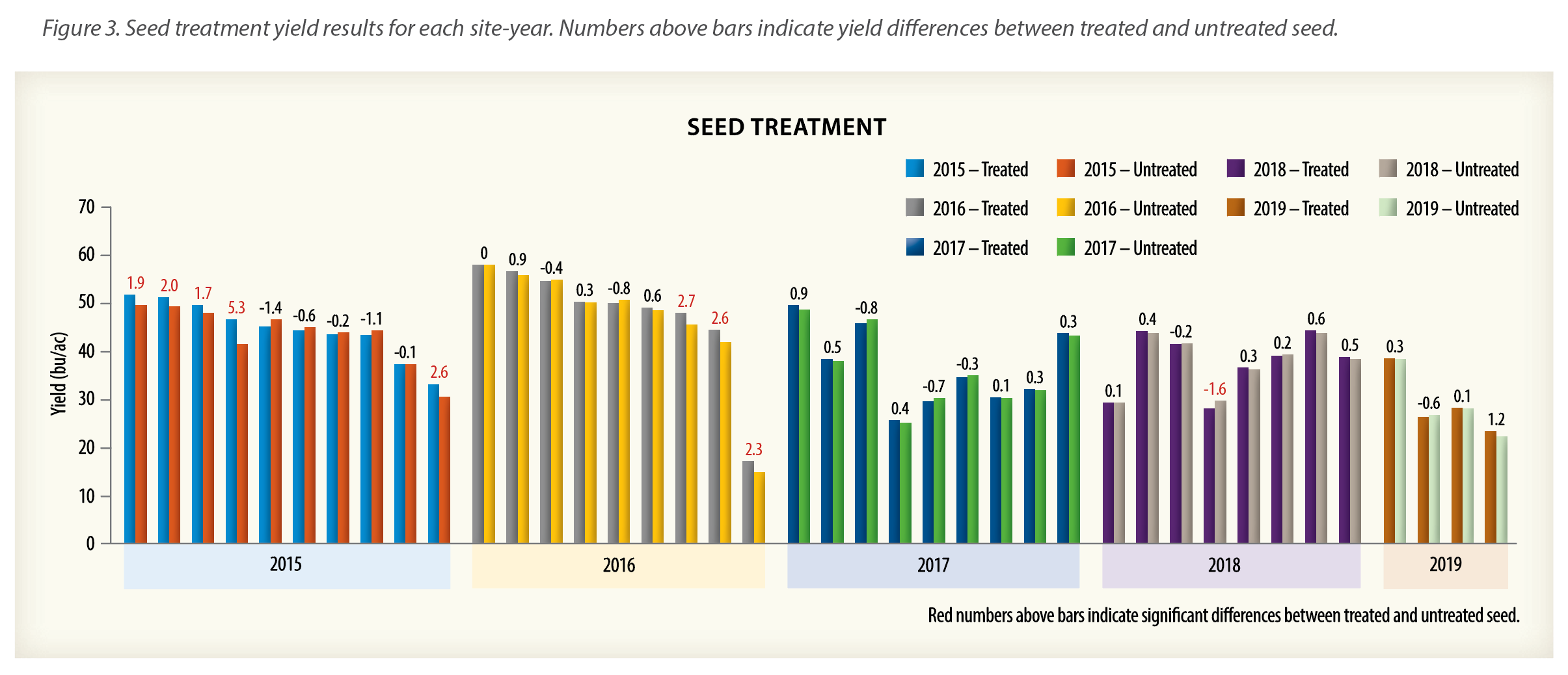 The OFN began comparing soybean yield with and without seed treatment in 2015. We now have five growing seasons of data, with a total of 41 sites. Out of all 41 locations, there have been eight statistically significant yield increases, and one significant yield decrease, for soybean with seed treatment compared to soybean without seed treatment (Figure 3). Most of the responsive sites were from 2015 and 2016, likely due to the seeding conditions in 2015 and 2016 vs. 2017, 2018 and 2019.