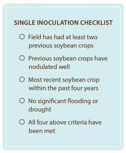 MPSG has developed a checklist to help guide the decision on double vs. single inoculant (see above). We don’t have a similar checklist designed for making a single vs. no inoculant decision, however, the trial data is being explored to determine if a reliable list should be developed. Before making a widespread inoculant management change across the farm, it would be wise to test out the new practice in one or two fields — perhaps even setting up an on-farm trial to compare strategies, to check nodule formation and yield.