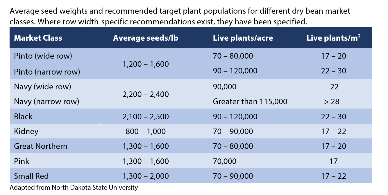 - Increase plant populations of pinto and navy beans grown in narrow row widths. Target 90,000 – 120,000 plants/ac for pinto and black beans, and greater than 115,000 plants/ac for navy beans.