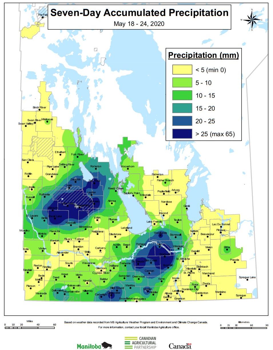 Seeding progressed quickly last week with warmer temperatures throughout the province. Precipitation was variable over the weekend. Areas around Riding Mountain National Park and Starbuck received the most rain, while some areas received none.- Pea and faba bean seeding is almost complete, with crops emerging and approaching the first node stage (V1) across much of the province. Some peas are as advanced as the third to fourth node (V3 to V4) stage. As crops are emerging, keep an eye out for early season disease and insect pests like root rots, cutworms and wireworms.