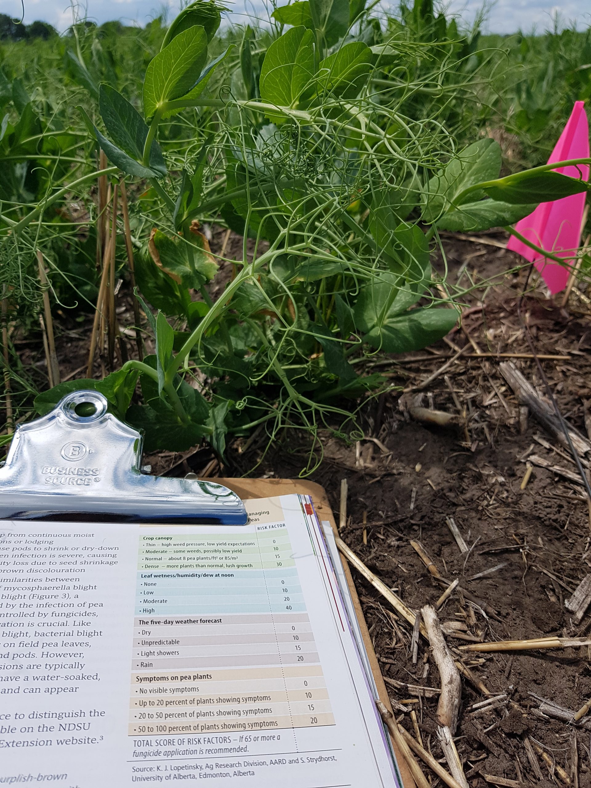 Before these trials are sprayed and established, we’re getting into these fields to determine our risk of disease using the Fungicide Decision Worksheet for Managing Mycophaerella Blight in Field Peas.