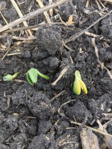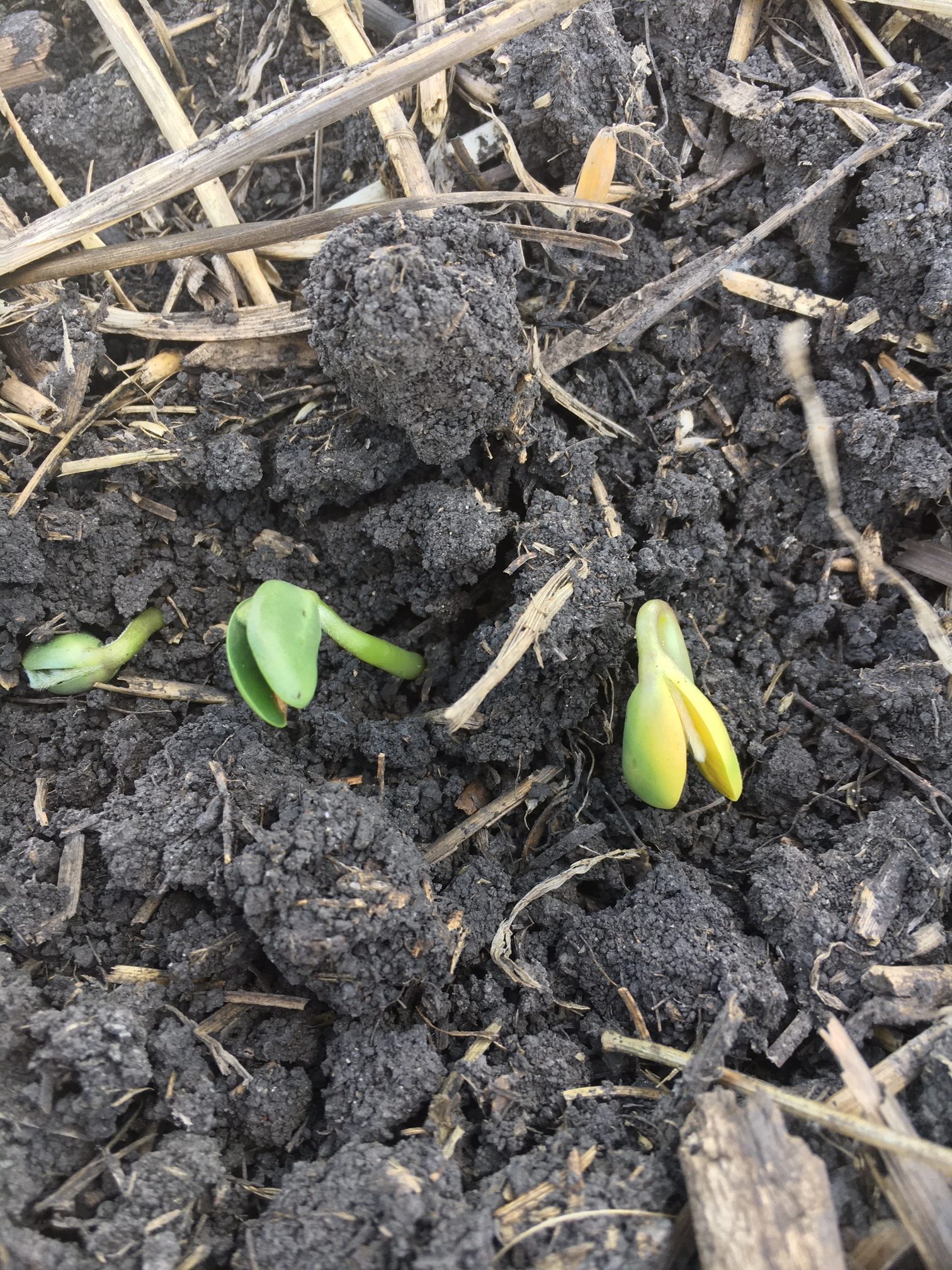 Soybeans emerging near Elm Creek on June 2, 2020 with yellow cotyledons – as stress symptom