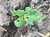 Symptoms: yellowing between leaf veins on young trifoliate leaves of soybeans and occasionally dry beans.- Caused by excess moisture, salinity, carbonates and/or high nitrate levels in the soil, impeding the uptake of iron into the plant.