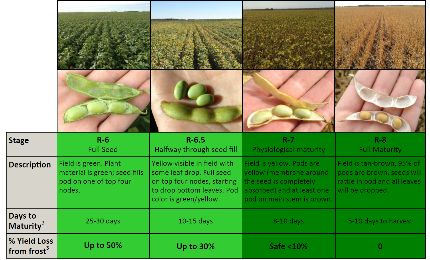 Soybeans at R6 to R7 and edible beans at R8 are susceptible to frost damage. Many soybean and dry bean crops in MB have reached maturity levels that are safe from frost. However, later-seeded fields and longer-season varieties that are still green are susceptible to damage.