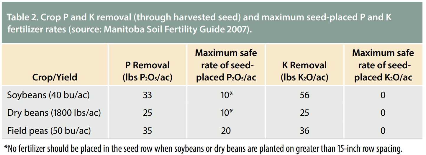 - The P and K removed with harvested soybean seed is high and there is a limited crop capacity to tolerate seed-placed fertilizers.