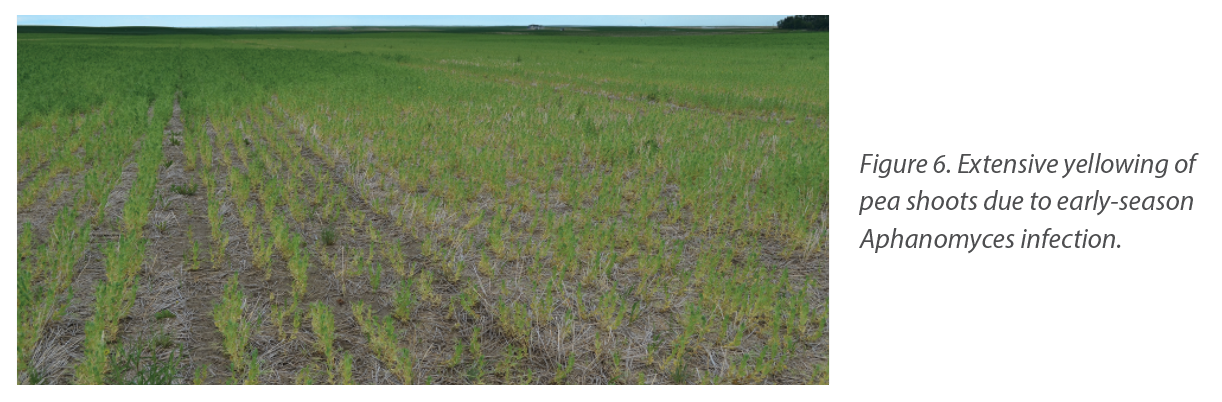 Aphanomyces root rot is historically the most destructive disease of peas. Although reported in Manitoba for the first time in 1997 and into the early 2000s, it has recently made a resurgence and was reported in Saskatchewan for the first time in 2012 and Alberta in 2013. Since that time, prairie-wide surveys have revealed that it is widespread across all pea- and lentil-growing regions of the prairies. Wet and warm soil conditions favour the disease, and thus the wet growing seasons of the early-mid 2010s likely caused the widespread explosion of the disease.