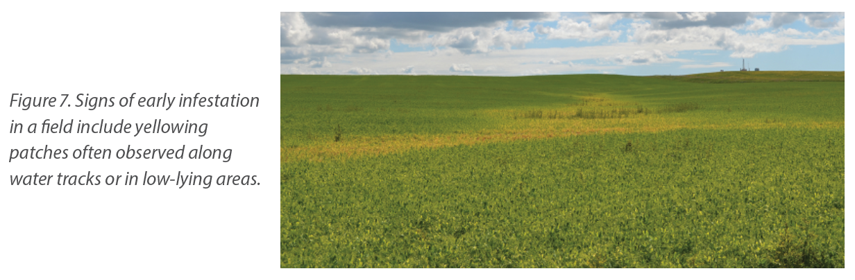 In low to moderately infested fields, the disease is first evident as yellow patches in low-lying areas of the field, or in areas where water accumulates, like water tracks or seepage areas (Figure 7). It is important to note these test areas, as the pathogen can quickly spread across the whole field during periods of flooding or water-saturation of the field. An inoculum density of 100 oospores/g soil is the threshold needed to cause moderate to severe root rot. Oospore levels can increase quickly in these infested patches. A field with a low inoculum level, or a few small patches, can produce sufficient inoculum to destroy a subsequent pea crop, particularly if wet conditions persist in favouring infection. In highly infested fields, the pathogen tends to be distributed fairly uniformly across the field, and the entire field can show yellowing. However, areas prone to water collection will be worse.