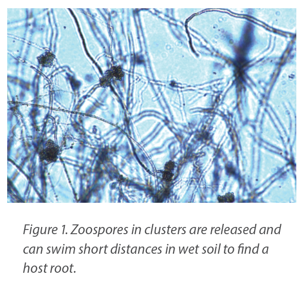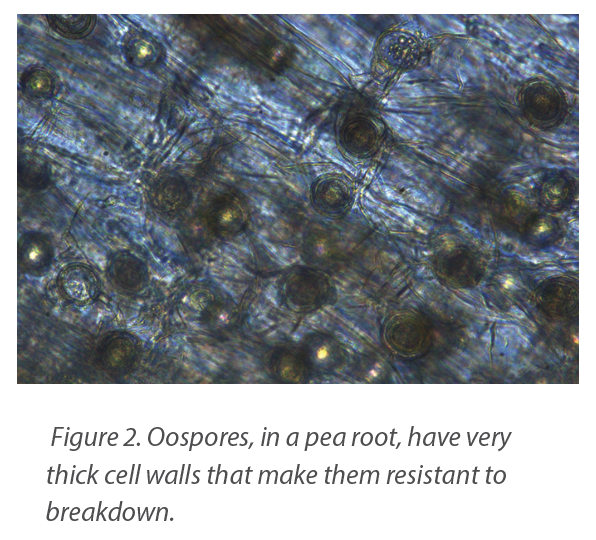 Aphanomyces root rot is caused by Aphanomyces euteiches. This micro-organism belongs to a group called oomycetes or water-moulds because, unlike fungi, there is a portion of its life cycle that is dependent on water. Zoospores, microscopic swimming cells (Figure 1), are released from resting spores (oospores, Figure 2) under high soil-moisture conditions when a host crop is present. The zoospores can swim through free water in soil pores to find and attach to a host root. The zoospores then germinate to produce mycelia (thread-like strands) that infect host roots and quickly spread throughout the root system. When root nutrients have been used up, or environmental conditions become inhospitable, the pathogen initiates sexual reproduction to produce thick-walled oospores. Oospores survive in soil and plant debris in a dormant state for many years and can withstand freezing and dry conditions. Thus, A. euteiches overwinters exclusively as oospores. Oospore germination and infection can occur at any time over the growing season, as long as soil moisture is adequate. Although zoospores are the propagules of A. euteiches that directly infect the host, their quantity is dependent on the number of viable oospores within the soil. Therefore, oospores are considered the primary drivers of disease and quantification