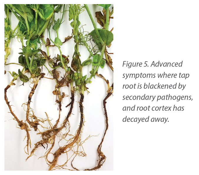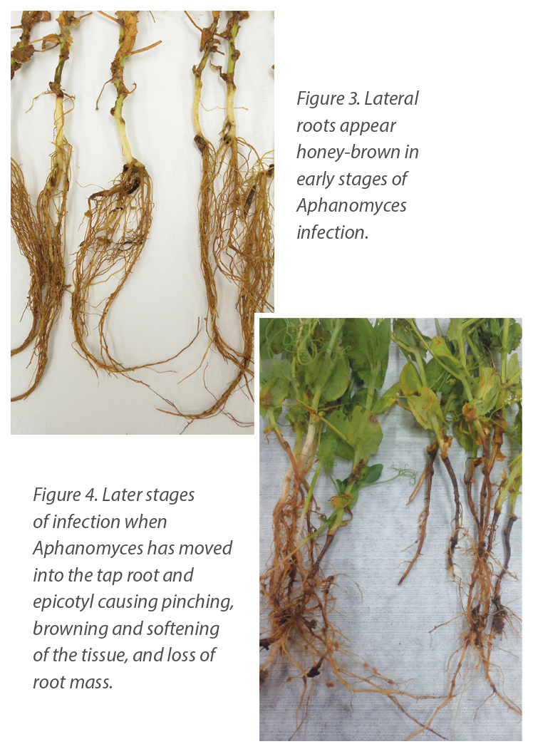Roots infected by A. euteiches appear honey-brown in colour, with symptoms appearing on lateral roots very quickly after initial infection (Figure 3). However, it is difficult to catch the disease at this stage, as infection spreads through the roots quickly. The root cortical (or outer) tissue becomes soft and dark brown in colour as the disease progresses, and infection moves into the main taproot and epicotyl (portion between the seed and green stem), which becomes pinched, honey-coloured and soft (Figure 4). This is the stage where Aphanomyces root rot is the most recognizable and can be distinguished from other root rot pathogens. However, this stage is also short-lived, and in later stages, when infected plants are pulled from the soil, the cortex becomes easily sloughed off and remains behind in the soil. Oospores are produced in these outer infected tissues. In later stages, the epicotyl and taproot also become dark or blackened, usually due to infection by other organisms, such as Fusarium and Pythium species (Figure 5). When an infection is severe, shoots become wilted, chlorotic and stunted, with leaves of infected plants progressively yellowing from the bottom of the shoot upward (Figure 6). Shoots are particularly affected if infection occurs early in the season. Because the root system becomes decayed, nodule production is also affected, which further exacerbates symptoms, as plants will not be able to fix nitrogen needed for growth. As a result of both root infection and nodule loss, infected plants produce fewer pods, a reduced number of seeds per pod, or may even die before pod development. The degree of yield loss is largely dependent on the environment. Very wet conditions in spring (approximately 4–6 weeks after seeding), followed by dry conditions, often result in the most significant yield losses, as plants will have a diminished root system that cannot deal with drought stress.