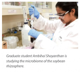 Soil populations of Bradyrhizobia bacteria that fix nitrogen when nodulated within soybean roots have been an important focus in the rotation study for Dr. Ivan Oresnik and his new PhD student Ambihai Shayanthan. Their current project builds on the completed MSc thesis of Patricia Ordonez, who followed the change in Bradyrhizobia populations within a growing season and between seasons. Patricia confirmed that Bradyrhizobia can persist in Manitoba soils from year to year. Ambihai will take this project to the next step by studying rotation effects on the biome of microbes surrounding the soybean root in the rhizosphere. She is very interested in understanding which soil microbes are enriched by the presence of soybean plants and those positively correlated with increased productivity and plant health.