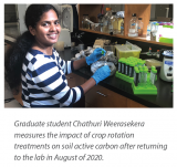 We know that crop rotation can improve both plant and soil health. Graduate student Chathuri Weerasekara is working with Dr. Lawley and Dr. Oresnik to measure the impact of the frequency of soybeans in rotation on new measures of soil health. Soybeans are a low-residue crop that don’t return as much carbon to the soil as cereal crops like wheat or corn. This experiment allows us to track carbon inputs from crop residues over time and to follow resulting changes in soil carbon. Chathuri is looking at both the traditional stable pools of soil carbon as well as a new method called active carbon that focuses on the carbon pool that can easily feed and be decomposed by soil microbes. Chathuri has also been following the concentration of soil enzymes released by microbes as an index of microbial activity for processes involving the cycling of carbon, nitrogen and phosphorus in the soil. After analyzing archived samples from 2017 and 2019 (four and six years into the study, respectively), Chathuri has not found any differences between rotation treatments in total or active carbon pools at both the Carman and Kelburn sites. However, soil enzyme activity has consistently been lowest in the continuous soybean treatments at both sites. All of the interdisciplinary layers in this rotation study connect with the soil microbial community — both good and bad. These layers are going to help us to integrate the possible outcomes that farmers can expect as soybeans continue to be an important crop in Manitoba rotations.