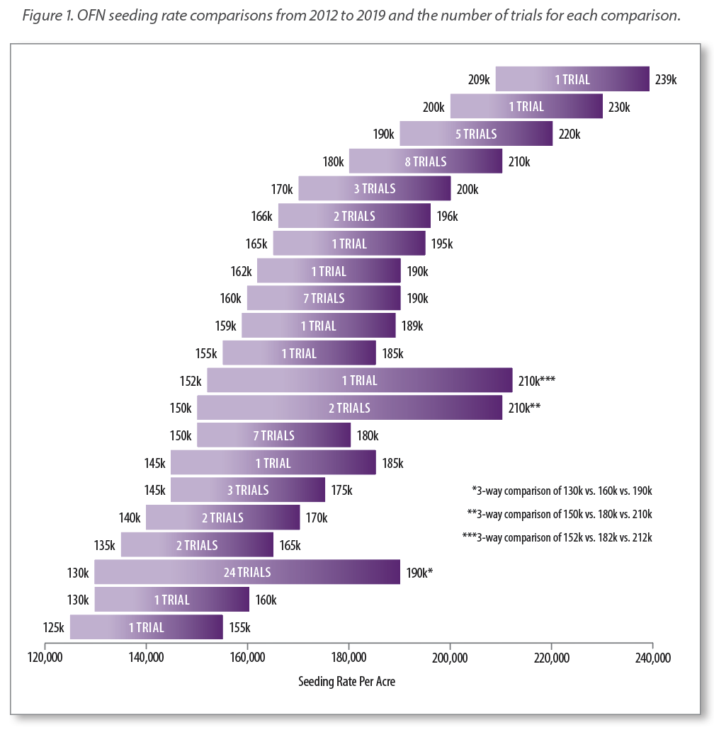 The On-Farm Network (OFN), MPSG’s in-house research program, has been investigating soybean seeding rates since 2012. Over seven years, a total of 75 soybean seeding rate trials were conducted, comparing seeding rates ranging from 125,000 to 239,000 seeds/ ac (Figure 1). Each trial compared two or three seeding rates. Although various combinations of seeding rates have been used across the 75 trials, the main question remains consistent: “Can I lower my seeding rate while maintaining my yield?” Generally speaking, the answer seems to be yes.