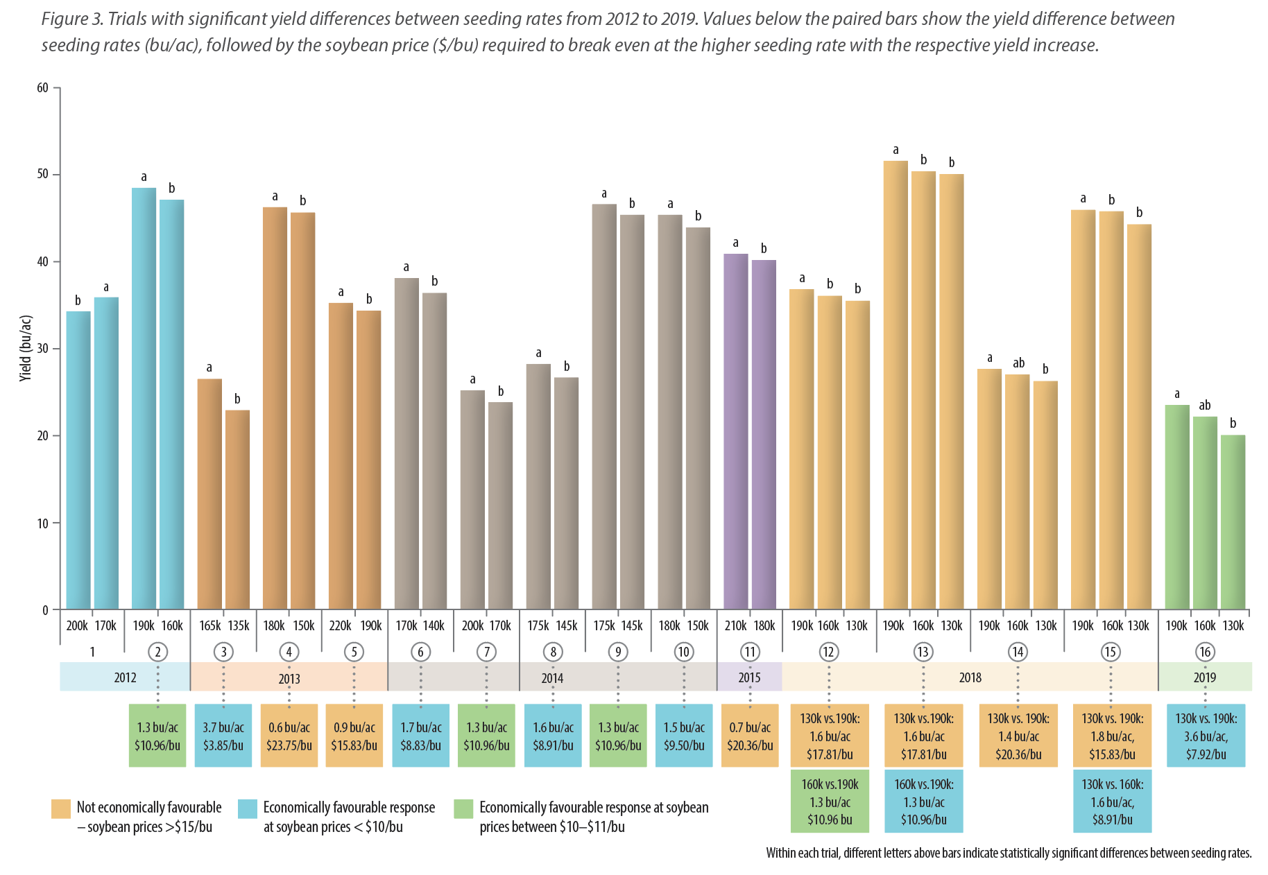 The paired bars in Figure 3 show the yield results for the 16 trials with significant yield differences between seeding rate treatments. Below the bars, the bu/ac value is the yield difference between the high and low seeding rate for each trial. Along with that yield difference is the soybean price required to offset the additional seed cost of the higher seeding rate at planting, based on the yield increase at harvest. These break-even prices range from $3.85/ bu, an obvious economically favourable yield response, to $23.75/bu, an out-of-the-question soybean price in today’s market. Examining the sites in Figure 2, only a handful of higher seeding rates resulted in yield increases great enough to cover the additional seed cost per acre, assuming realistic soybean prices. If we assume prices are below $10.00/ bu, about 8% of the trials had enough of a yield increase with a higher seeding rate to pay for the increased seed cost in the spring (Figure 2). If we are optimistic that prices will continue to be closer to $11/ bu in the future, then about 14% of the sites show a positive economic return from increased seeding rate. Whether we are optimistic, pessimistic or somewhere in between regarding soybean prices, 8–14% isn’t a very high success rate of favourable economic outcomes. Does this mean we can all reduce our seeding rates next spring? If so, how low can we go? Unfortunately, there isn’t likely to be a one-size-fits-all answer.