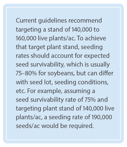 The On-Farm Network (OFN), MPSG’s in-house research program, has been investigating soybean seeding rates since 2012. Over seven years, a total of 75 soybean seeding rate trials were conducted, comparing seeding rates ranging from 125,000 to 239,000 seeds/ ac (Figure 1). Each trial compared two or three seeding rates. Although various combinations of seeding rates have been used across the 75 trials, the main question remains consistent: “Can I lower my seeding rate while maintaining my yield?” Generally speaking, the answer seems to be yes.