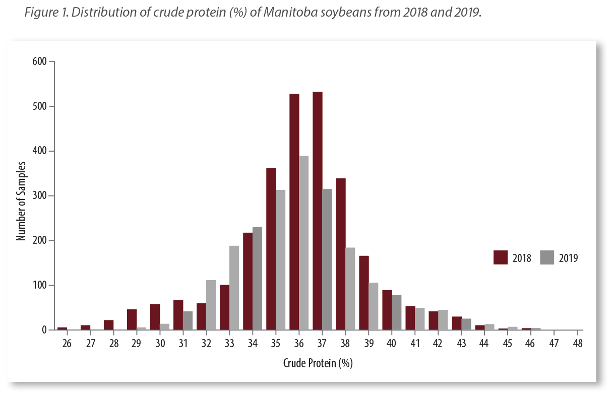 Figure 1 depicts the variability in crude protein content of soybeans from 2018 and 2019. The average (minimum; maximum) values of crude protein (%) for the 2018 and 2019 cropping years were 35.79 (25.37; 46.75) and 35.55 (28.06; 47.07), respectively. These data show that there is considerable variability in protein content, and understanding the factors influencing this variability will be important in guiding soybean development and selection for Manitoba conditions.