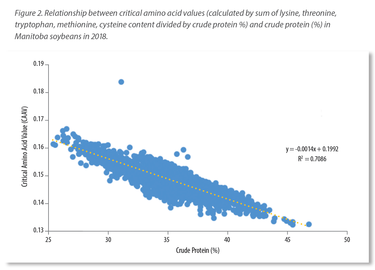 While low protein values (<33%) are present within these cropping years, the data in Figure 2 highlights the importance of considering the CAAV in addition to protein content to understand the true feeding values of the soybean meal for livestock feeding in particular. There is a negative relationship between the CAAV and the total protein content for Manitoba-grown soybeans, similar to observations that have been made in the northern U.S. As such, the true feeding value of Manitoba-grown soybeans may be underestimated if the focus is kept solely on the crude protein content.
