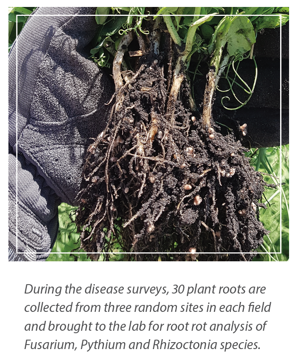 Unfortunately, we were not able to get a beat on Aphanomyces in 2020 due to COVID-19. In previous years, Aphanomyces was found in 83% of pea fields sampled in 2019, 56% in 2018, 47% in 2017 and 77% in 2016.