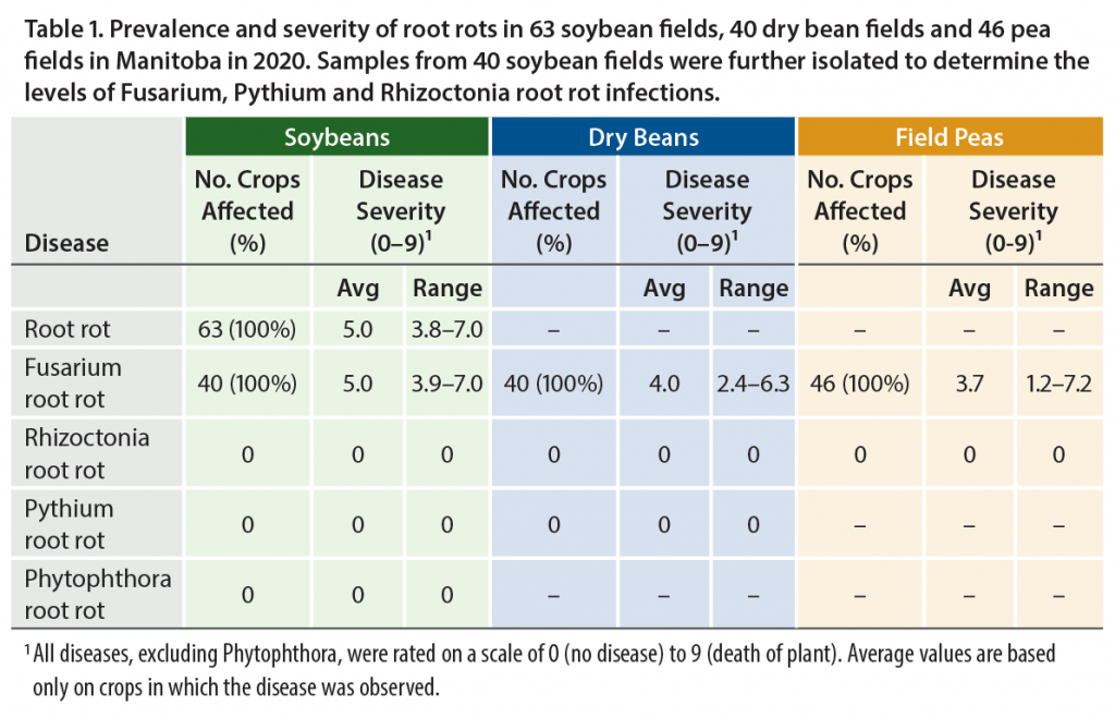 In 2020, 63 soybean fields, 40 dry bean fields and 46 pea fields were surveyed in Manitoba for root diseases (Table 1). COVID-19 restricted some surveillance and testing capacity in the province in 2020, but for the most part we were able to capture a pretty clear picture of what happened in terms of pulse and soybean root diseases.