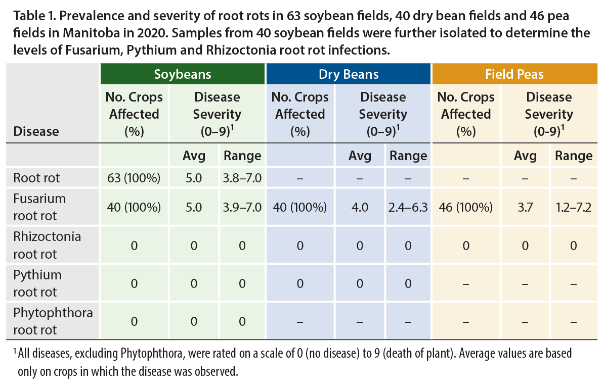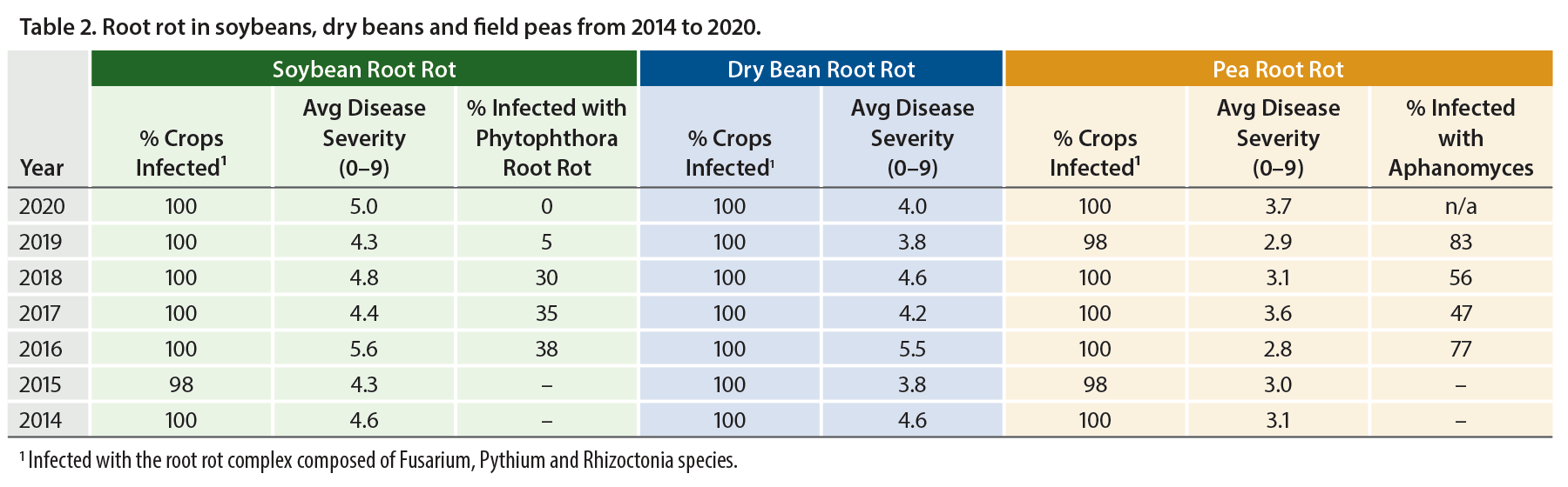 The clear picture that emerged from 2020 was that Fusarium root rot continues to be our most prevalent disease infecting soybean, dry bean and pea roots (Table 1). Compared to 2019, the severity of Fusarium infections rose in soybeans and peas, from 4.3 to 5.0 and 2.9 to 3.7, respectively, and was consistent in dry beans, moving from 3.8 in 2019 to 4.0 in 2020 (Table 2). This increased root rot severity from 2019 to 2020 can largely be attributed to more moisture in 2020.