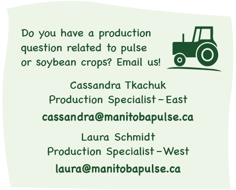 Keep an eye on yellow patches in low-lying areas of the field, or in areas where water accumulates, and consider getting these areas tested for Aphanomyces. Or, consider signing up for the annual pulse and soybean disease surveys by contacting one of MPSG’s Production Specialists: Laura (West) or Cassandra (East).