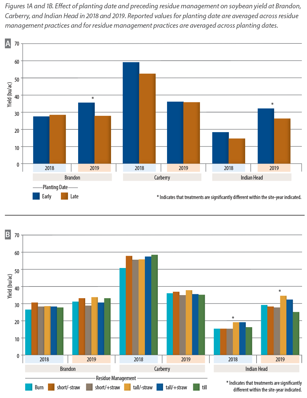 To look more closely at this question, a follow-up study is currently underway in western Manitoba and eastern Saskatchewan to assess the effect of a wider range of residue management practices (fall-tilled; fall-burned; short stubble with straw returned; tall stubble with straw returned; short stubble with straw removed; tall stubble with straw removed) on earlier and later planted soybean (approximately May 10 and two weeks later, as weather permits). In this study, preceding crops are wheat at Brandon and Carberry, and canary seed at Indian Head.