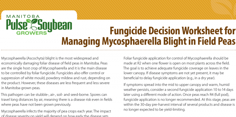 Mycosphaerella (Ascochyta) blight is the most widespread and economically damaging foliar disease of Manitoba field peas. Peas are the single host crop of Mycosphaerella and it is the main disease to be controlled by foliar fungicide. Fungicides also offer control or suppression of white mould, powdery mildew and rust, depending on the product. However, these diseases are less frequent and less severe in Manitoba-grown peas.
