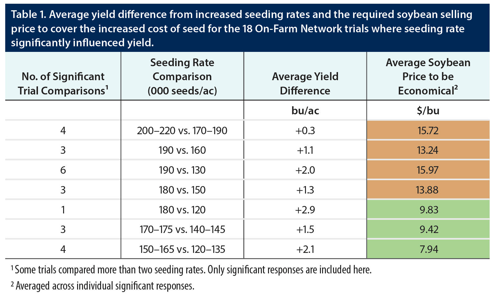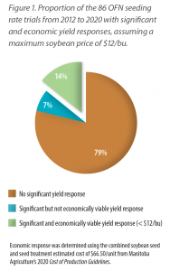 In 2020, the On-Farm Network (OFN) completed another 11 seeding rate trials, two of which had significant yield differences between treatments. Adding the 2020 trials to the overall dataset, the frequency of soybean response to seeding rate remains at 21% (Figure 1). Out of 86 total trials, 18 have had a significant difference in yield between seeding rates, with varying economic outcomes (Table 1).