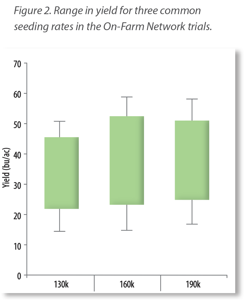 Soybean seed is expensive, there are no two ways about it. Based on current soybean seed prices, reducing seeding rate by 30,000 seeds/ac, for example, results in savings of $14.25/ac. What are the steps to define an optimal seeding rate? Before we launch in, I think it is important to set a foundation of individualization — the optimal seeding rate for one farm in one area of Manitoba, in one growing season, may not be the same as the optimal rate for another farm in another area or perhaps another season. Seeding rate sets the foundation for yield, but the outcome of that seeding rate is very farm- and field-specific. We see this variation in yield outcomes at the same seeding rates across trials in the OFN. For example, at seeding rates of 130k, 160k and 190k, yield has varied as much as 45 bu/ac across sites and years (Figure 2).