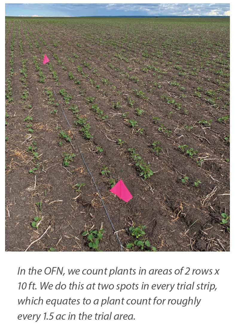 There are multiple methods for plant counting to determine stand, but they all involve counting the number of plants in a given area and then multiplying that by the necessary factor to convert it to plants/ac. MPSG’s handy Bean App has a built-in plant stand calculator to make this as simple as possible for you in the field.