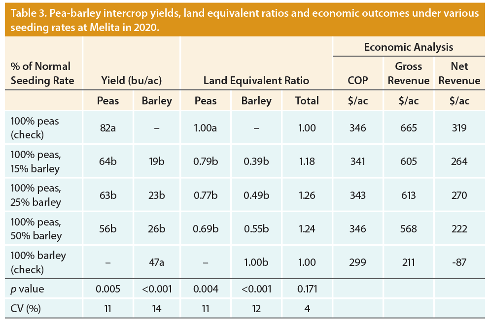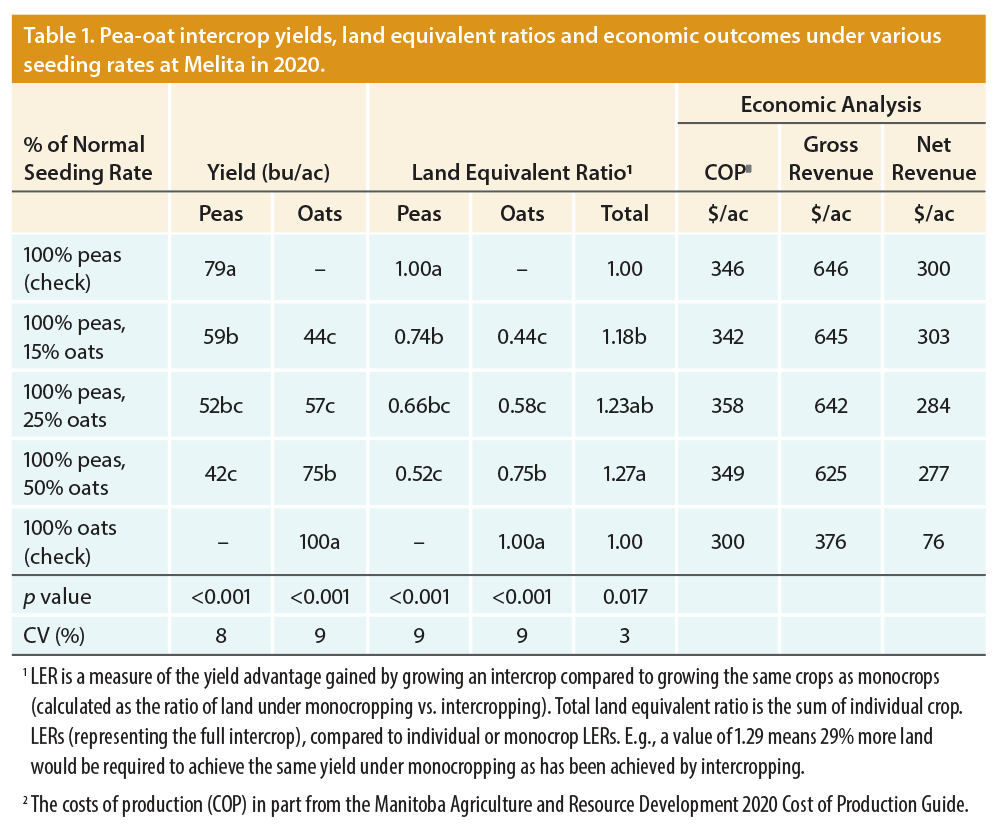 Aside from neutral economic outcomes, other intercrop benefits were discovered, such as slightly lower leaf disease and earlier maturity in barley, ease of harvest, a significant increase in barley and oat protein, and fewer pea splits in pea-oat intercrops compared to monocrop peas.