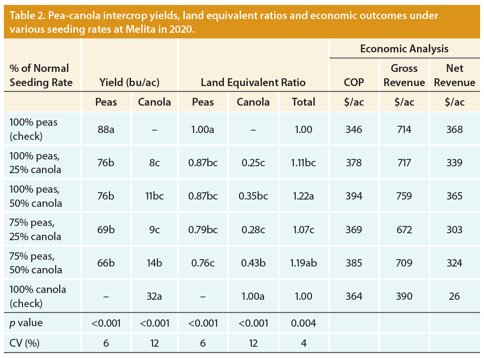 Though it’s only the first year of results, they found that all three crops did well with peas. Whether it was peas with canola, barley or oats, the combinations increased field yield (total land equivalent ratio (TLER)) by 22–27%, respectively. Nitrogen fertilizer was not applied to the trials, as WADO knows from previous pea–canola research that it usually has no benefit to the overall yield or economics. When economics were applied to these substantial yield increases, benefits quickly evaporated due to additional seed cleaning costs associated with intercrops (Tables 1, 2 and 3). It was an excellent pea year at Melita, but the net revenues of the intercrops were no better nor no worse than monocrop peas, except for the barley intercrops that generally had lower net revenue.