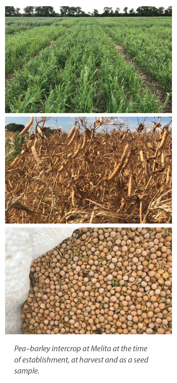 Aside from neutral economic outcomes, other intercrop benefits were discovered, such as slightly lower leaf disease and earlier maturity in barley, ease of harvest, a significant increase in barley and oat protein, and fewer pea splits in pea-oat intercrops compared to monocrop peas.