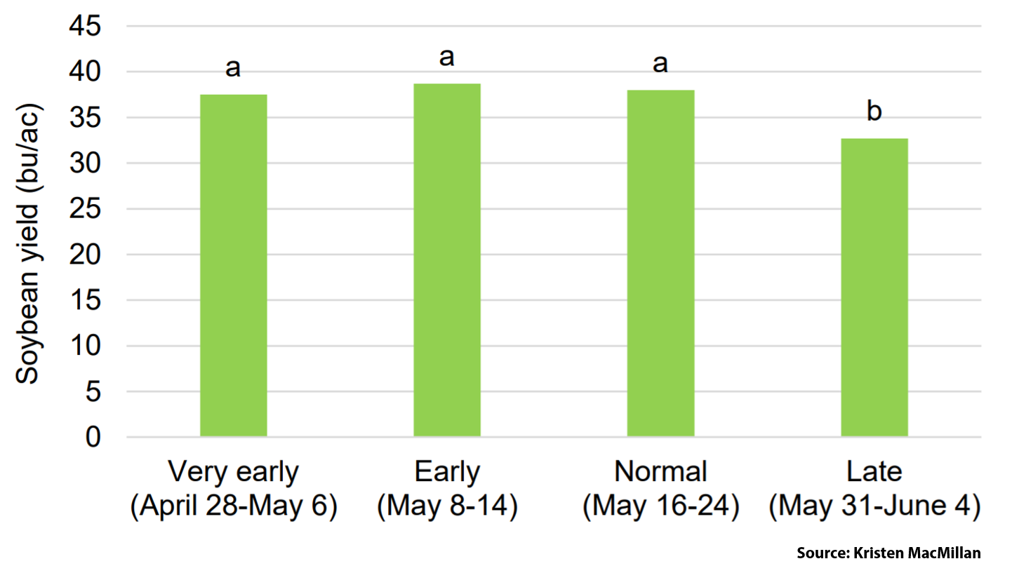- Flexible throughout the month of May. Research from the Pulse and Soybean Agronomy Lab has shown soybean yields to be statistically similar when planted from April 28 to May 24.