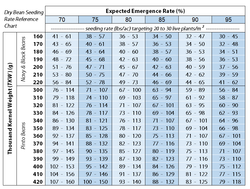 - Target plant populations vary with market class, seed size and, in some cases, row width (see table below). Dry bean seed is susceptible to damage from handling, whether you’re cleaning seed, treating seed, or running it through equipment. Soak tests reveal if seed coats have been cracked or damaged and are a useful tool to help you adjust your seeding rates before planting.