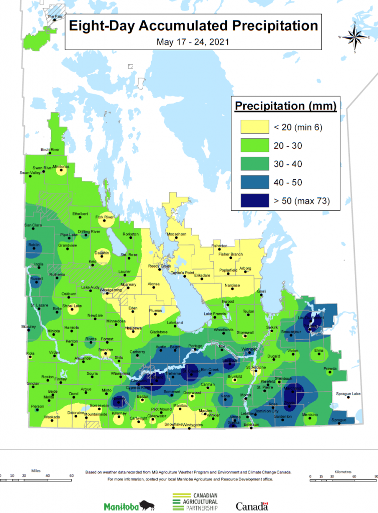 Find more detailed weather stats, including rainfall amounts from the past 8 days and rainfall since May 1 in the Manitoba Agriculture and Resource Development Crop Weather Report.