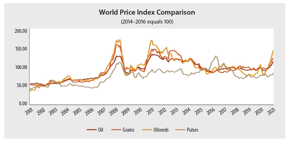 Global price indices for grains, oilseeds and pulses set new record highs in both 2007 and 2008. Values dropped off in 2009 because of production responses.