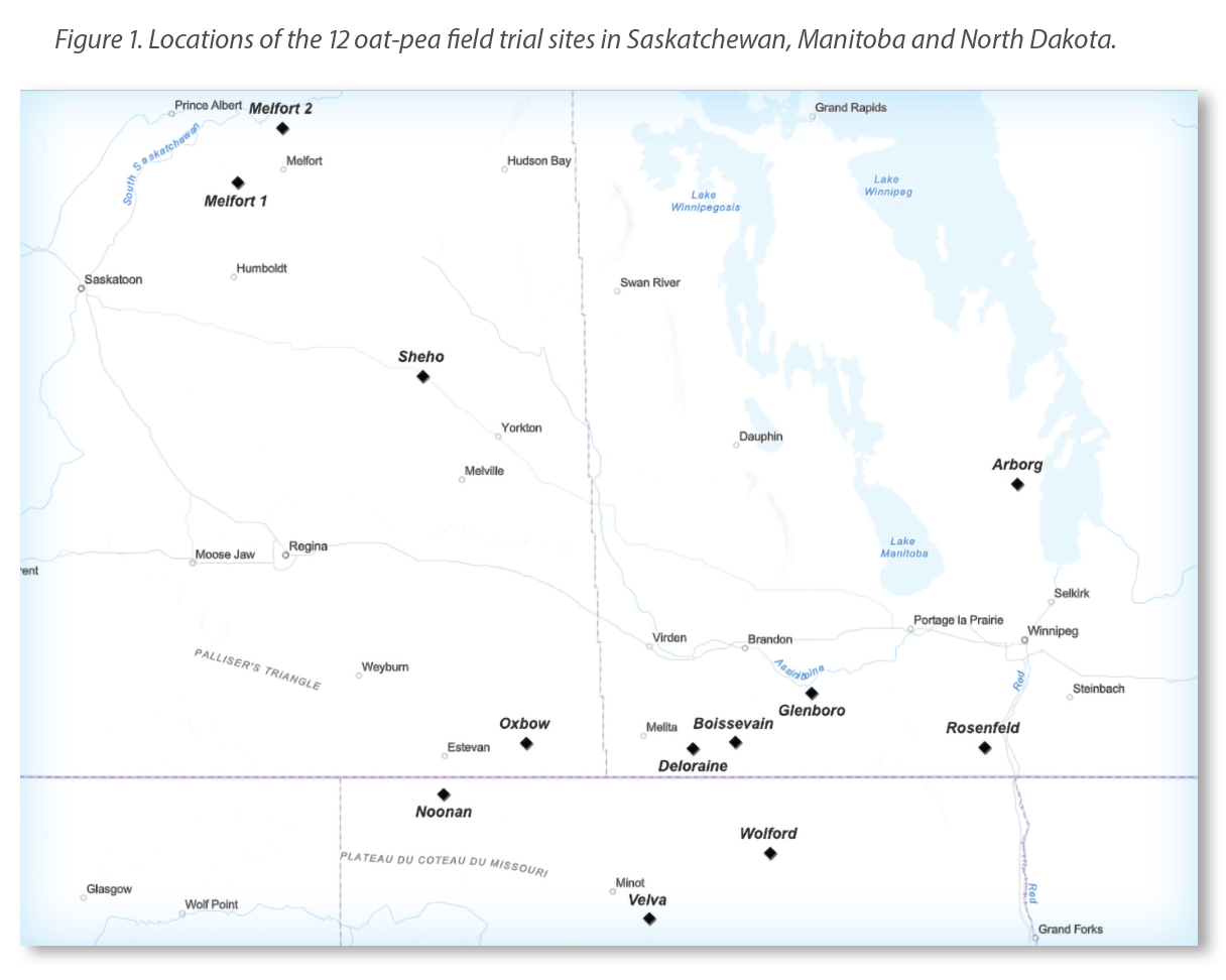 Twelve on-farm oat-pea trial sites were located in Saskatchewan, Manitoba and North Dakota during the 2020 growing season (see Figure 1). The trials placed 10-acre oat-pea plots adjacent to 10-acre monocrop oat plots, allowing for side-by-side comparisons of oat-pea intercrop production with monocrop oat production at each site. Appreciable variation exists across soil types and precipitation levels in the broad geographic area covered by the trial sites.