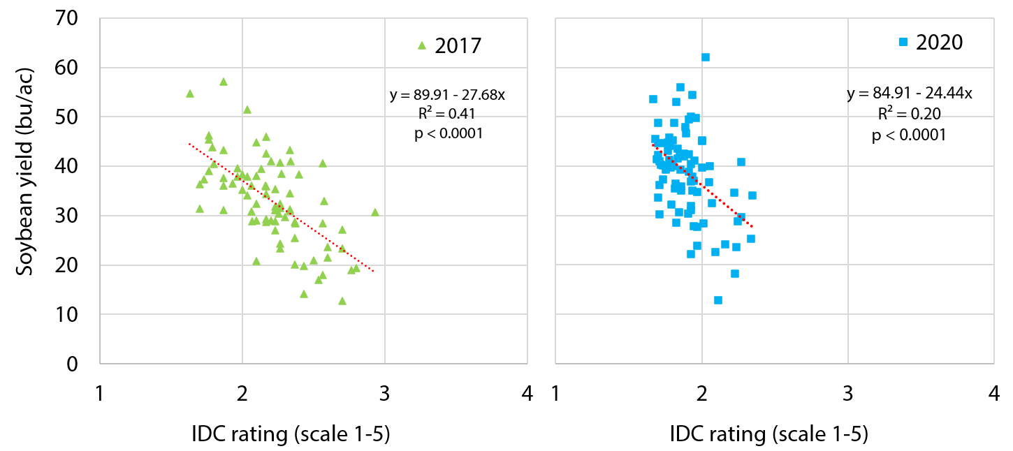 Research has been underway in Manitoba, looking at the relationship between IDC score and soybean yield of Manitoba-grown varieties, led by Kristen P. MacMillan (Soybean and Pulse Agronomy Lab, University of Manitoba). Results have shown that for each 0.1 unit increase in IDC score, soybean yield is estimated to be reduced by 2.4-2.8 bu/ac, on average.