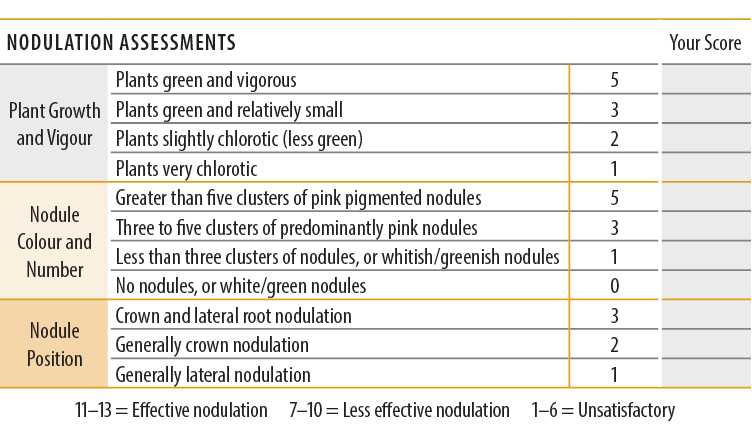 - Follow the nodule scorecard below, rating plant growth and vigour, nodule colour and number, and nodule position. Cut nodules open to assess the colour. If they are pinkish-red inside, that means they are actively fixing N. Brown, white or green nodules are considered inactive.