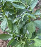Blister beetles tend to cluster on plants because they emit a pheromone that attracts other blister beetles. This cluster feeding is quite noticeable, but on a whole-field basis, it is usually not economical to control them. In fact, some species of blister beetles will actually feed on grasshopper eggs. These are the black and grey blister beetles we often see (in the genus, Epicauta).