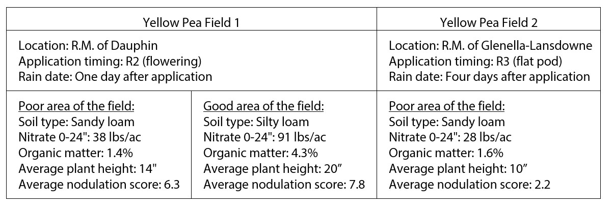 Rescue applications in peas have not been well researched. This year, we’ve identified a few fields with insufficient nodulation that are showing signs of nitrogen deficiency (yellowing of lower leaves and crop stunting). To investigate how peas may respond to an in-season nitrogen application we’ve set up replicated and randomized small plots in two fields in western Manitoba comparing 50 lbs N/ac broadcast SuperU at R2 (flowering) and R3 (flat pod) versus untreated. Crop and soil characteristics from poor and good areas of the fields before the application of nitrogen are in the table below.
