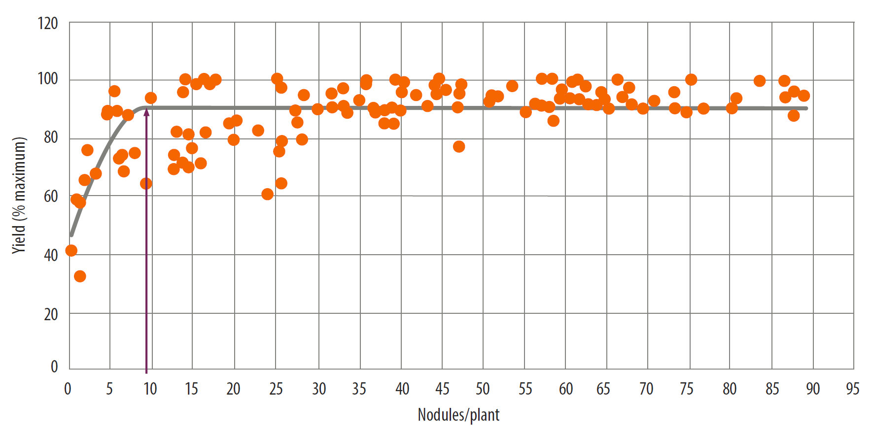 - Count the number of nodules per root system. If each plant has at least 10 root nodules of any size, your soybean crop has achieved adequate nodulation.