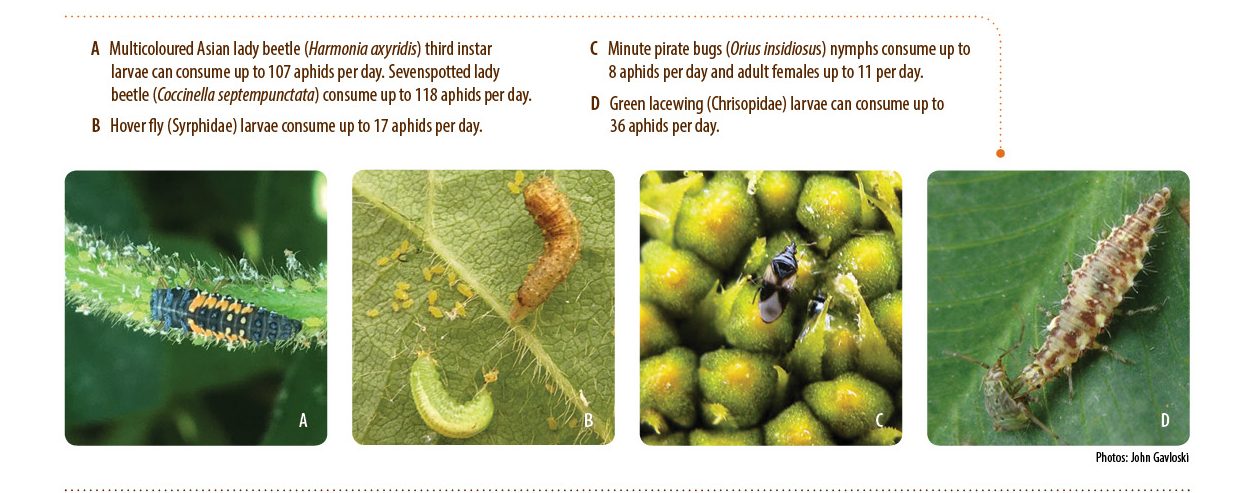 - Natural enemies may provide sufficient control of low aphid populations. The AphidAdvisor app calculates a dynamic action threshold based on soybean aphid and natural enemy counts. Key predators to scout for are lady beetle adults and larvae, green lacewing larvae, hover fly larvae, minute pirate bugs, Aphidoletes larvae and aphid mummies caused by parasitic wasps.
