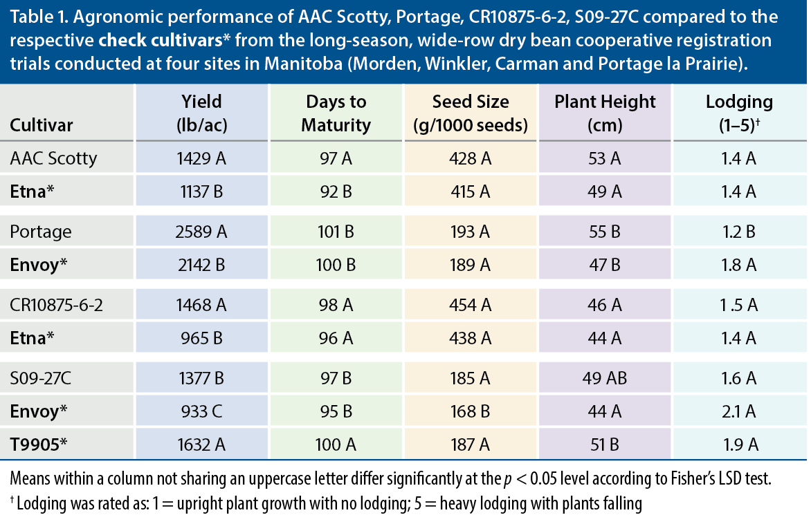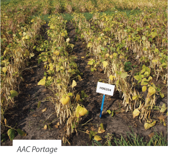 AAC Portage was registered in 2009 and marketed by Canterra Seeds in Canada and the U.S. It has very upright growth, which makes the variety suitable for direct harvest. Portage is a high-yielding navy bean variety with indeterminate growth, good seed quality and early maturity (Table 1). Portage is adapted to the Red River Valley of Manitoba. Its average yield was 21.3% higher than Envoy, while their maturity is similar. AAC Portage was the first navy bean variety in western Canada to be developed that has partial resistance to CBB. More information can be found in the publication, Portage common bean in CJPS (https://doi.org/10.4141/cjps2010-015).